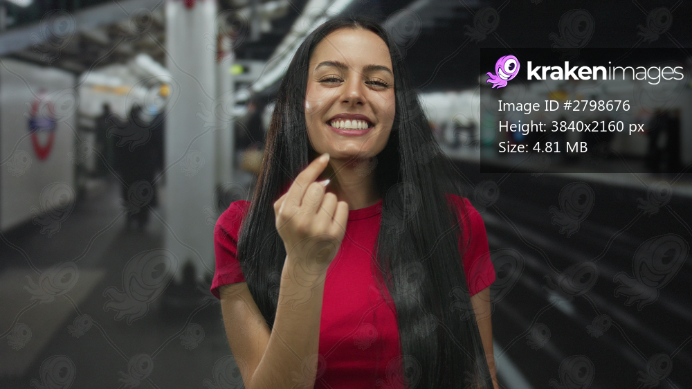 Hispanic woman in a red shirt smiling and gesturing at an indoor train station with blurred railway and commuters in the background.