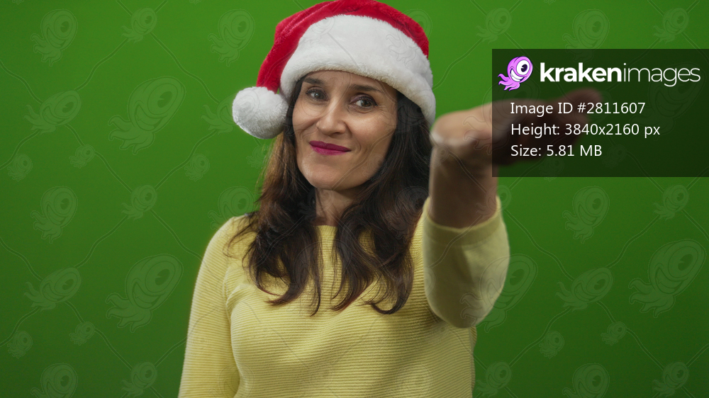 Hispanic woman in a santa hat extends an open hand in a friendly gesture against a vibrant green wall, capturing the festive and warm spirit of the christmas season. - Kraken Images