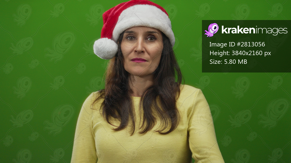 Hispanic woman in a santa hat extends an open hand in a friendly gesture against a vibrant green wall, capturing the festive and warm spirit of the christmas season. - Kraken Images