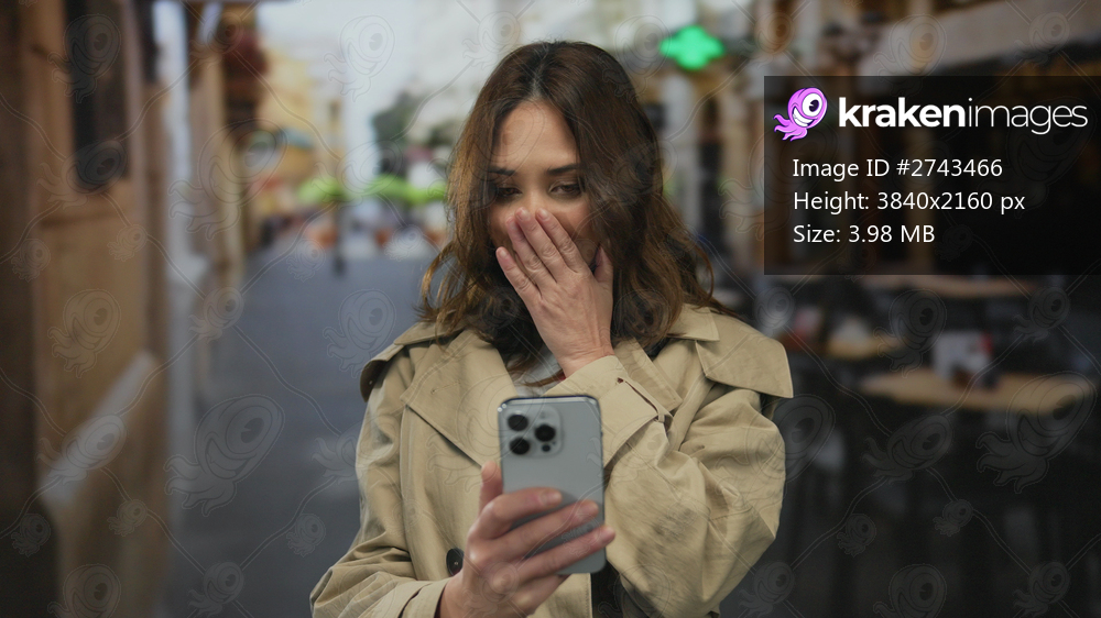 Hispanic woman in a trench coat holds a smartphone in shock on a busy outdoor city street with restaurants and cafes around.