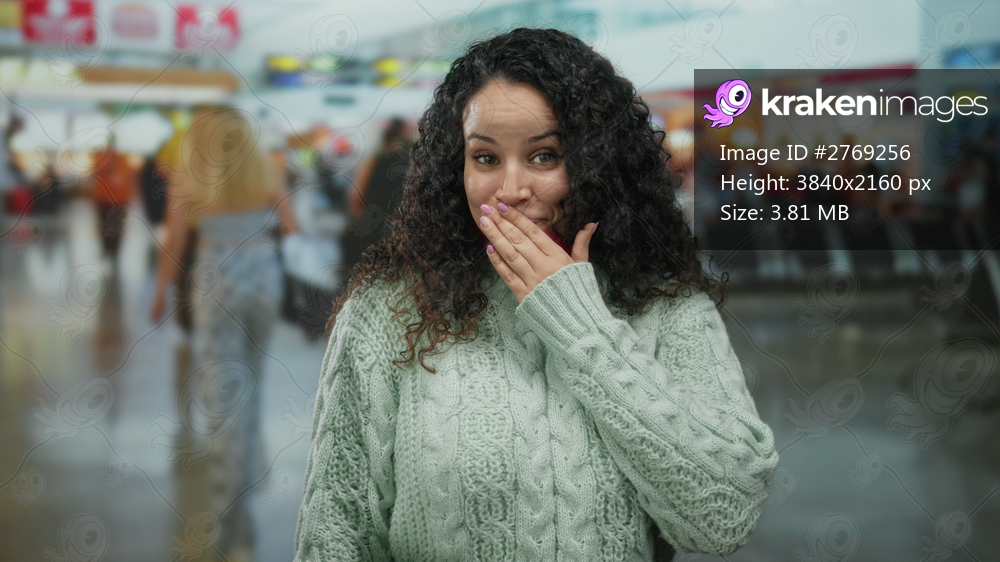 Hispanic woman in airport terminal indoor covering mouth with hand while wearing sweater amidst busy travelers.