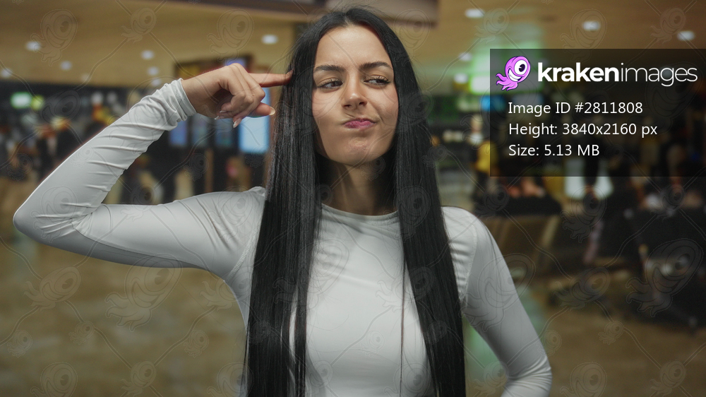 Hispanic woman in an airport makes a humorous crazy gesture with her finger to her head, wearing a white shirt, expressing playful frustration indoors with blurred crowd in the background. - Kraken Images