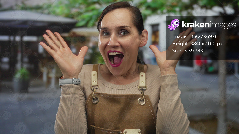 Hispanic woman in an apron joyfully reacts on a lively outdoor street with cafes and trees, expressing surprise and delight in a vibrant urban setting. - Kraken Images