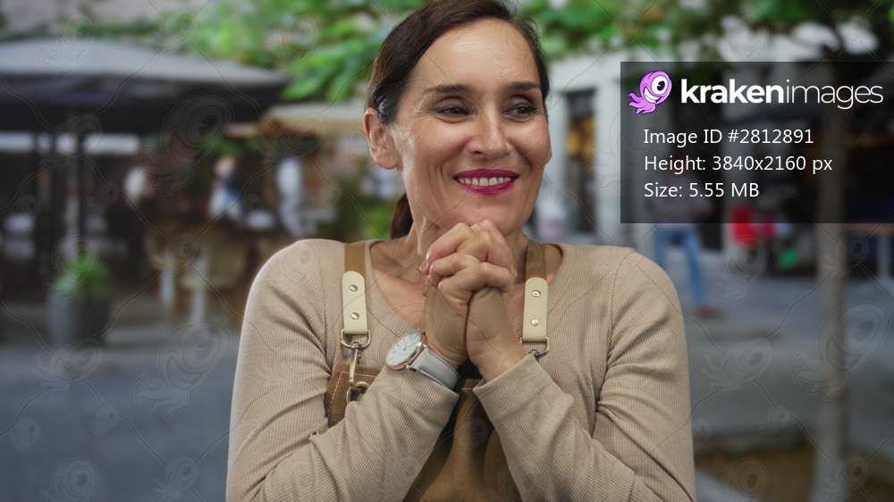 Hispanic woman in an apron joyfully reacts on a lively outdoor street with cafes and trees, expressing surprise and delight in a vibrant urban setting. - Kraken Images