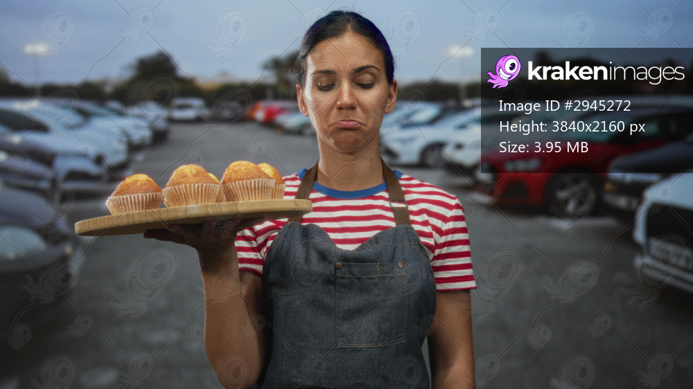 Hispanic woman in apron and striped shirt holds wooden tray of muffins amid parked cars on street, purses lips with one hand; disappointment.