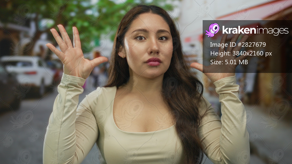 Hispanic woman in beige top raises open hands and gasps amidst parked cars and bakery storefronts on a city street; stress.