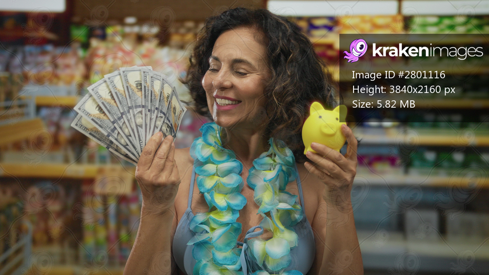 Hispanic woman in bikini with lei showcasing us dollars and piggy bank in indoor market