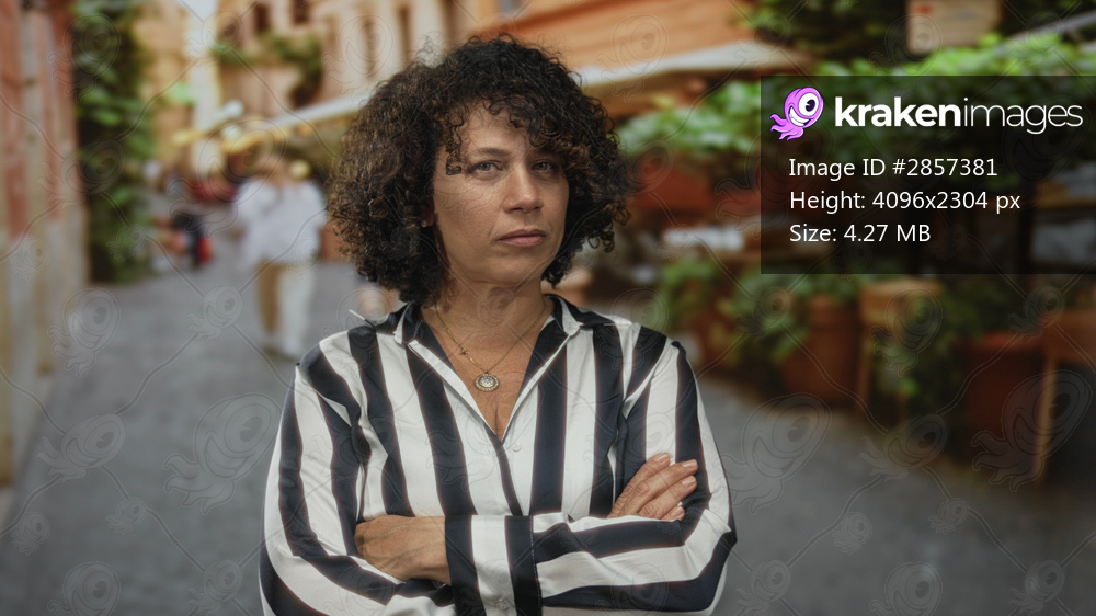 Hispanic woman in black and white striped blouse crosses arms on cobblestone street lined with potted greenery at outdoor cafe; rejection.