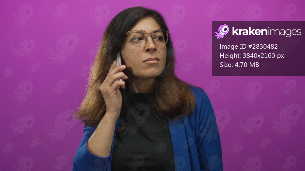 Hispanic woman in blue blazer tilts head in side profile while holding smartphone to ear in studio; concentration.