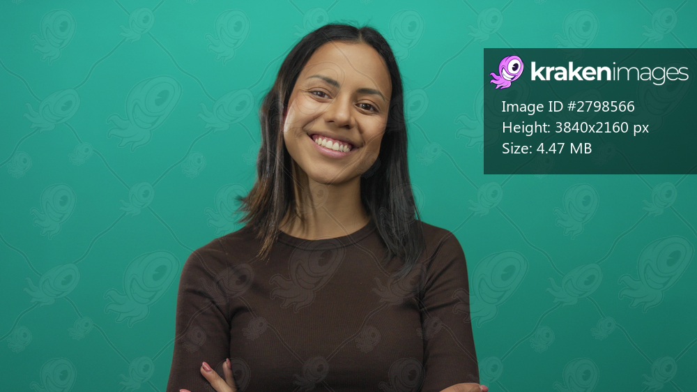 Hispanic woman in brown top smiling confidently against an isolated green background wall, capturing a modern and approachable vibe.