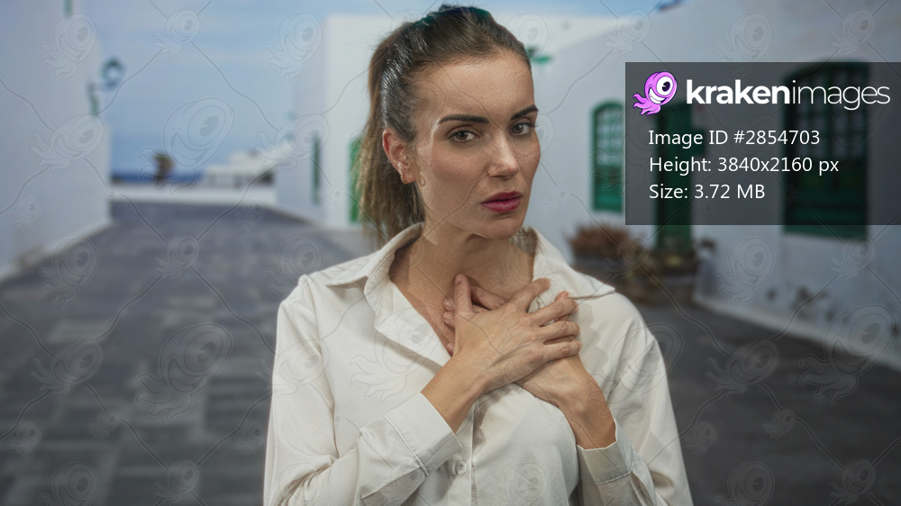 Hispanic woman in casual white shirt clutches chest from heartattack on a narrow sunlit street; panic.