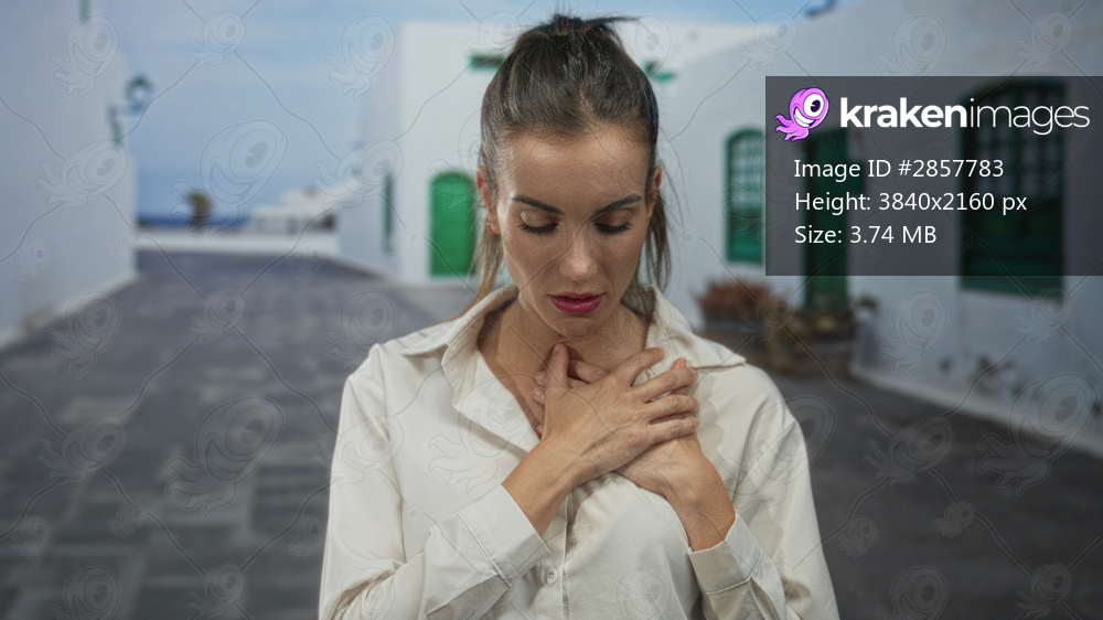 Hispanic woman in casual white shirt clutches chest from heartattack on a narrow sunlit street; panic.