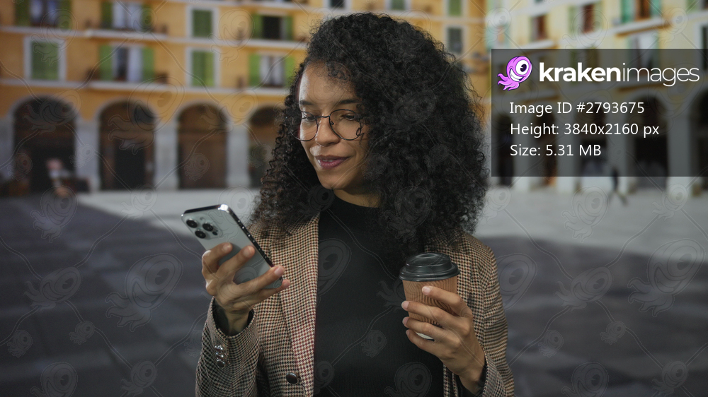 Hispanic woman in checked blazer with curly hair smiling and holding smartphone and coffee cup on street; cheerful.