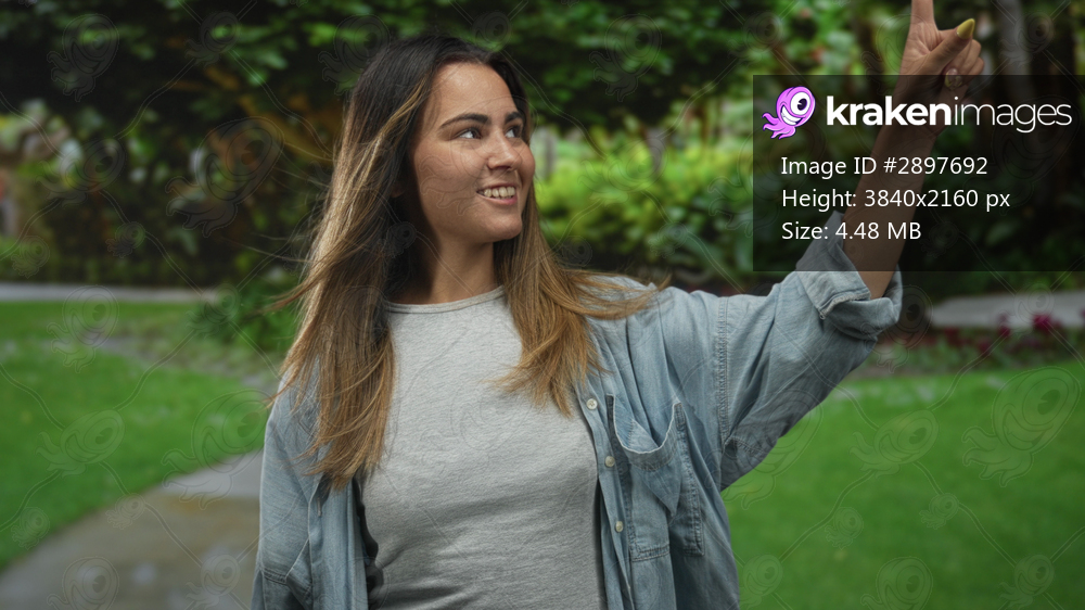 Hispanic woman in denim shirt points finger upward on a green park path, smiling and gazing toward the tip of her finger; optimism hope youthful curiosity. - Kraken Images