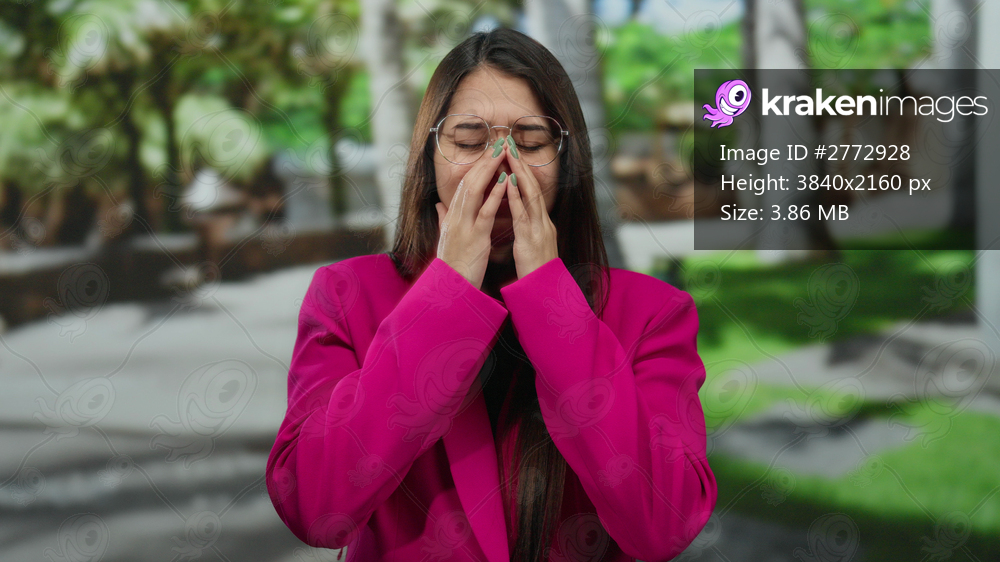 Hispanic woman in glasses and pink jacket standing outdoors in a park, expressing emotion with eyes closed and hands on face, surrounded by greenery and trees. - Kraken Images