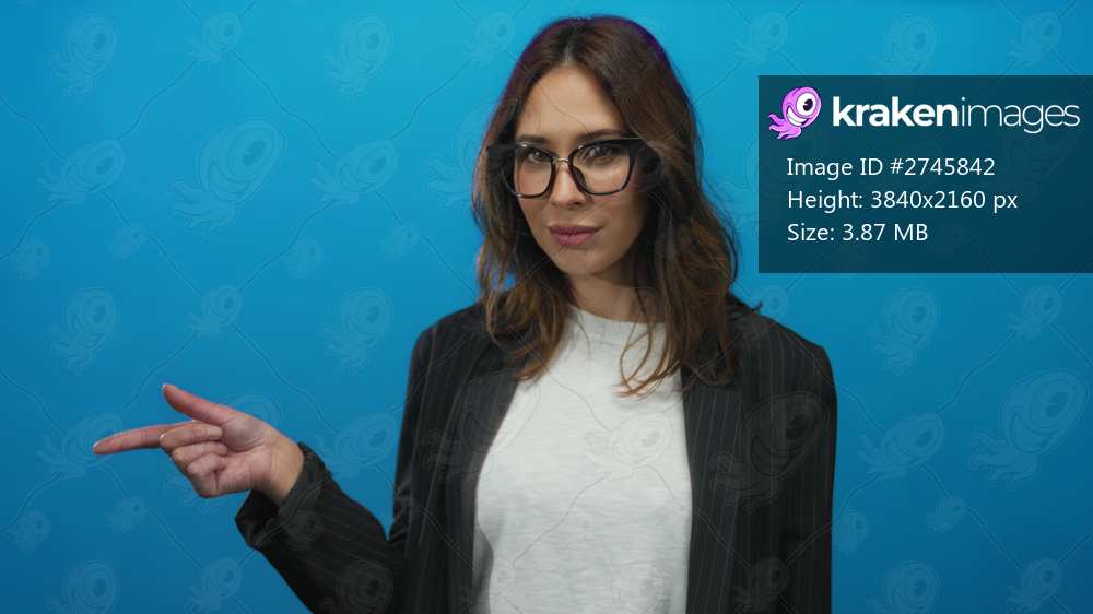 Hispanic woman in glasses pointing and gesturing call me against an isolated blue background in a modern, expressive pose, dressed in casual and professional attire. - Kraken Images
