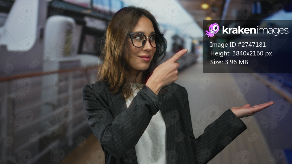 Hispanic woman in glasses presents something on a cruise deck, wearing a stylish outfit, enjoying the seaside with a serene expression and extended arm. - Kraken Images