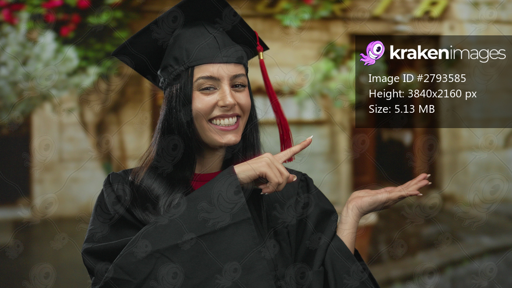 Hispanic woman in graduation cap smiling and pointing to her palm while standing outdoors against a charming rustic building background.