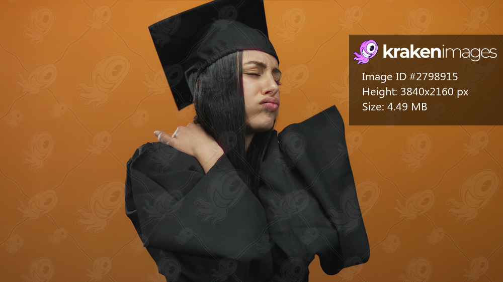 Hispanic woman in graduation gown experiencing shoulder pain against an orange wall exhibits discomfort with a pained expression in an isolated and symbolic academic setting. - Kraken Images