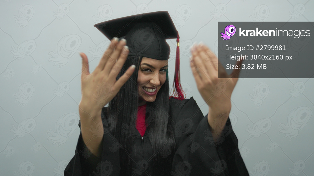 Hispanic woman in graduation gown smiling and reaching outwards in front of an isolated white background, capturing the joyous moment of academic achievement. - Kraken Images