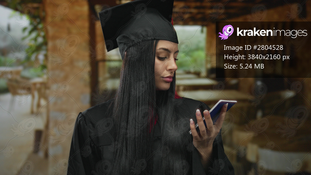 Hispanic woman in graduation outfit holding ukraine passport on restaurant terrace displays joy of achievement and multicultural experience outdoors.