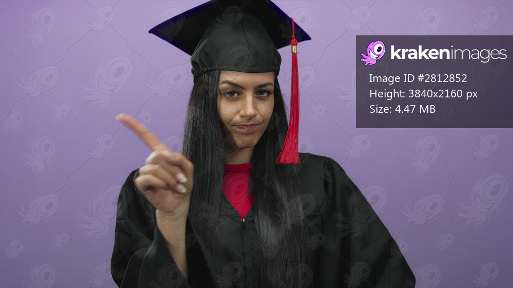 Hispanic woman in graduation uniform expressing disagreement against purple wall.