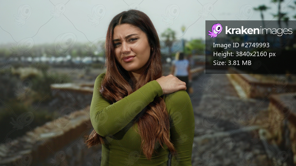 Hispanic woman in green shirt on a street holding her shoulder outdoors, showing concern with blurred urban background.