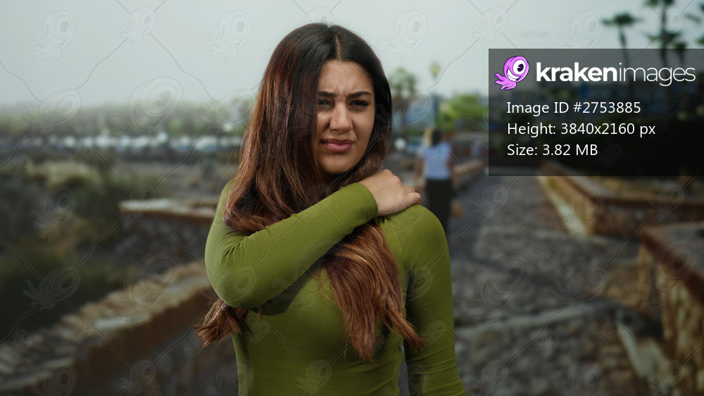 Hispanic woman in green shirt on a street holding her shoulder outdoors, showing concern with blurred urban background.