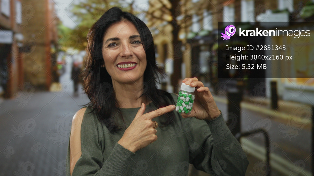 Hispanic woman in green sleeveless top points finger to clear pill bottle of green and white capsules while smiling on a sunlit street with storefronts; wellness. - Kraken Images