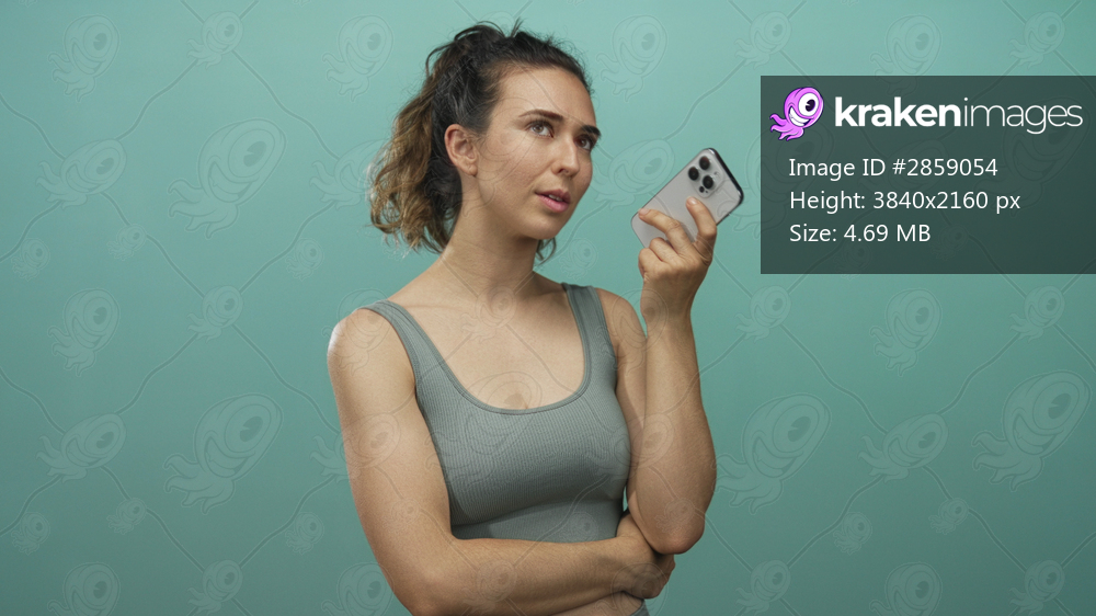 Hispanic woman in grey sleeveless top holds smartphone to lips with folded arm in green studio; curiosity.