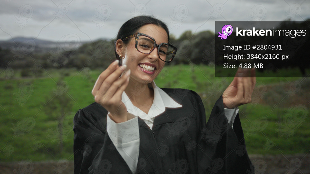Hispanic woman in judge uniform gestures money in park setting with joyful expression, captured outdoors with green nature background offering a vibrant contrast to her attire. - Kraken Images