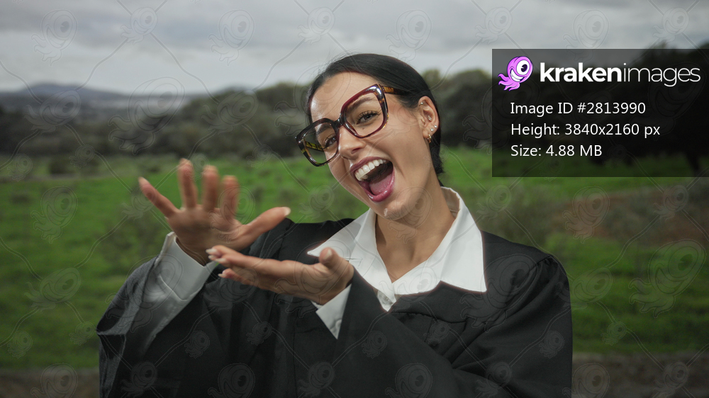Hispanic woman in judge uniform gestures money in park setting with joyful expression, captured outdoors with green nature background offering a vibrant contrast to her attire. - Kraken Images