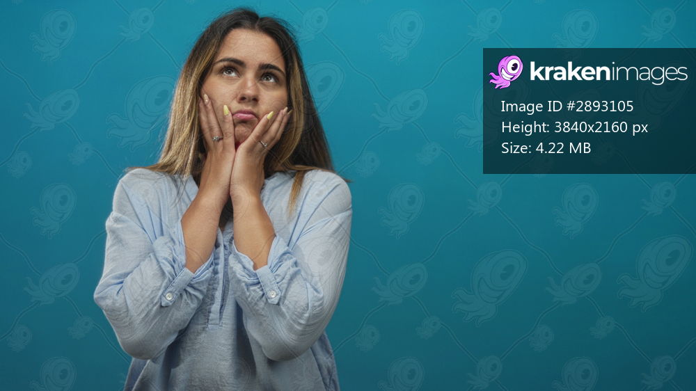 Hispanic woman in light blue blouse pressing cheeks with hands and closed eyes showing toothache in studio; discomfort contemplation.