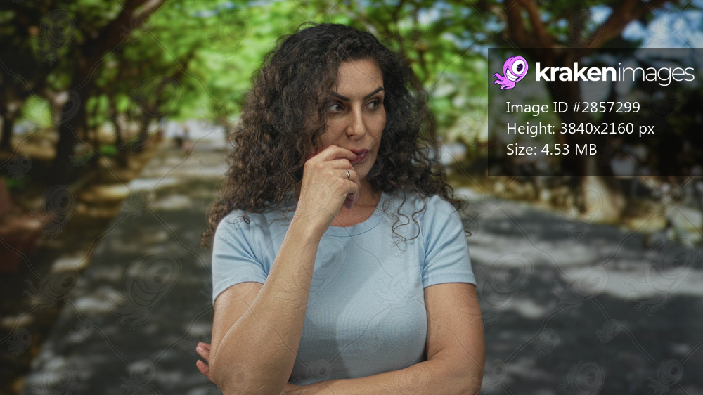 Hispanic woman in light blue shirt holds chin gesture on sunlit street lined with green trees; self reflection.