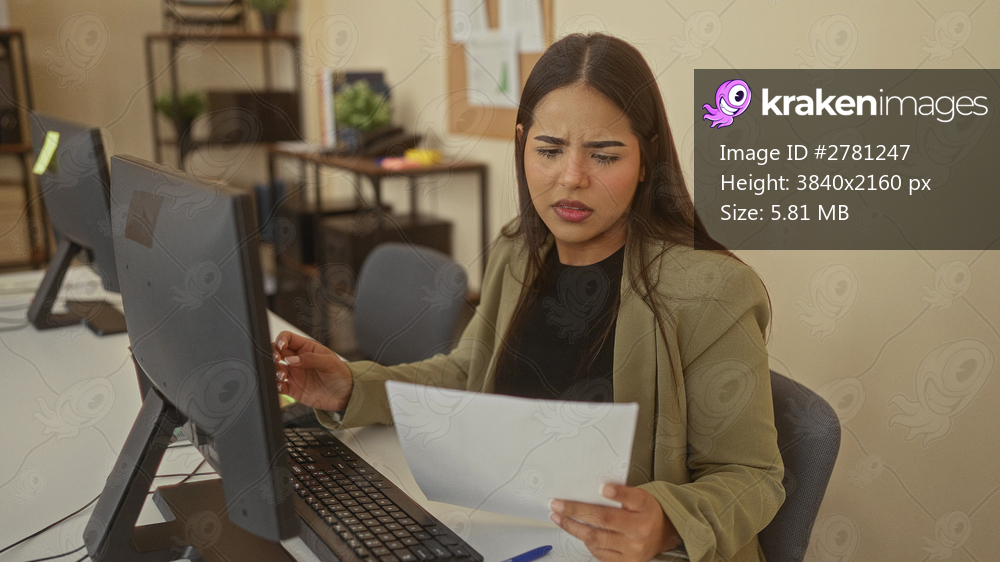 Hispanic woman in office studying paper at computer with a thoughtful expression, surrounded by a modern workspace, indicating a focused and professional work environment. - Kraken Images