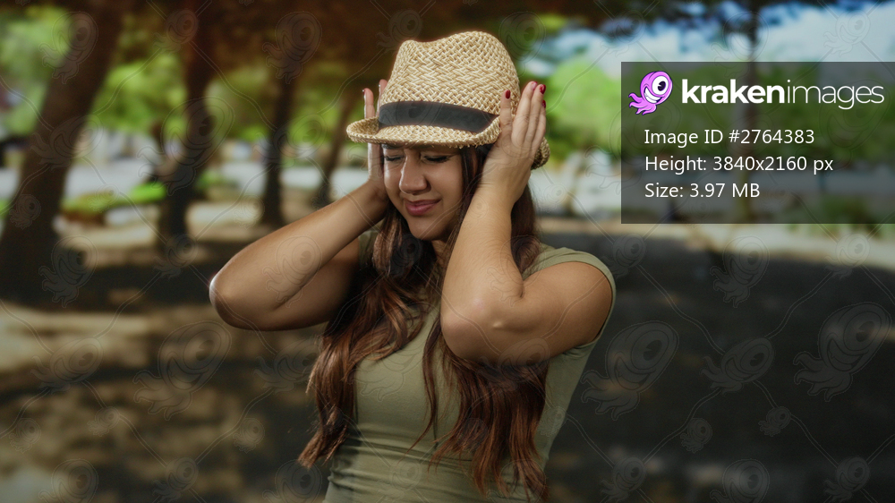 Hispanic woman in park wearing hat covers ears due to noise amid green trees and shadows outdoors.