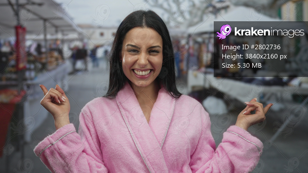 Hispanic woman in pink coat smiling and pointing at a bustling outdoor market street in the city, exuding a joyful and lively vibe amidst vibrant stalls. - Kraken Images