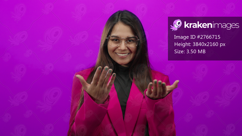 Hispanic woman in pink jacket makes come here gesture against vibrant pink background.