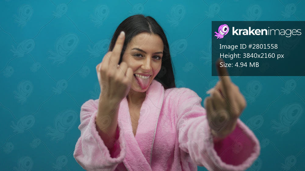 Hispanic woman in pink robe makes a bold gesture displaying middle fingers against a blue wall, conveying a playful and rebellious attitude.
