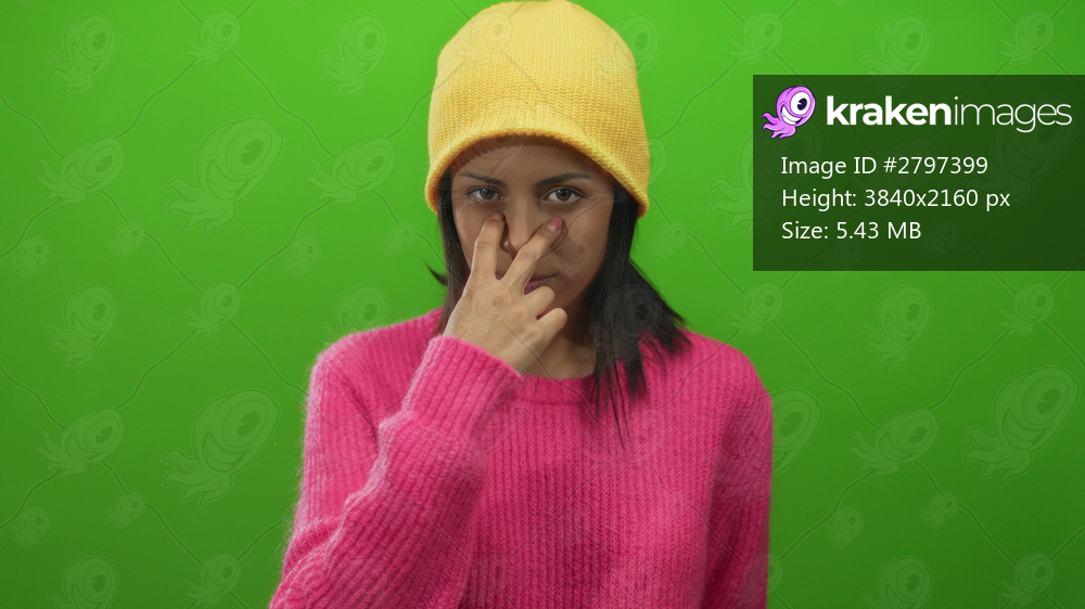 Hispanic woman in pink sweater and yellow beanie makes a watching gesture against an isolated green wall, expressing vigilance with a serious expression. - Kraken Images