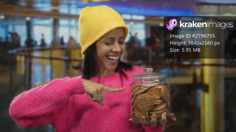 Hispanic woman in pink sweater and yellow beanie smiles while holding a jar of cookies in a vibrant hotel lobby.