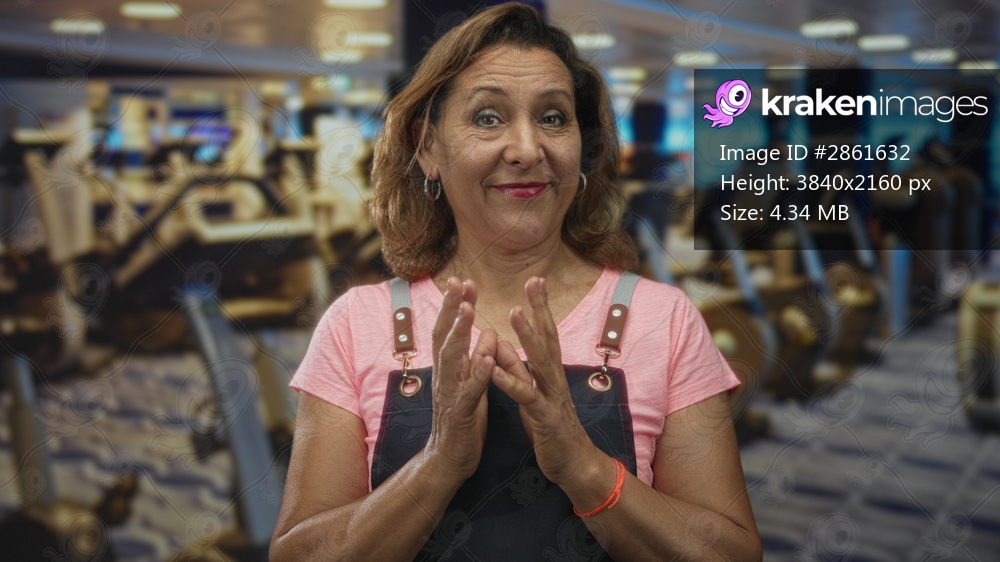 Hispanic woman in pink top and denim apron with brown hair smiles and claps hands in gym studio; encouragement.