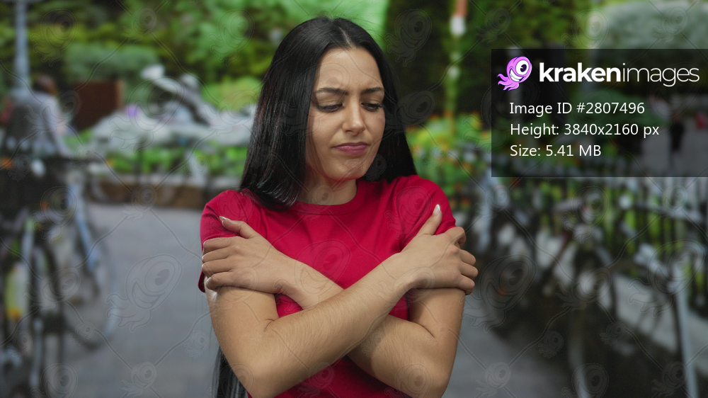 Hispanic woman in red shirt embraces herself in a chilly park setting with blurred greenery and bicycles, conveying cold discomfort and solitary introspection. - Kraken Images