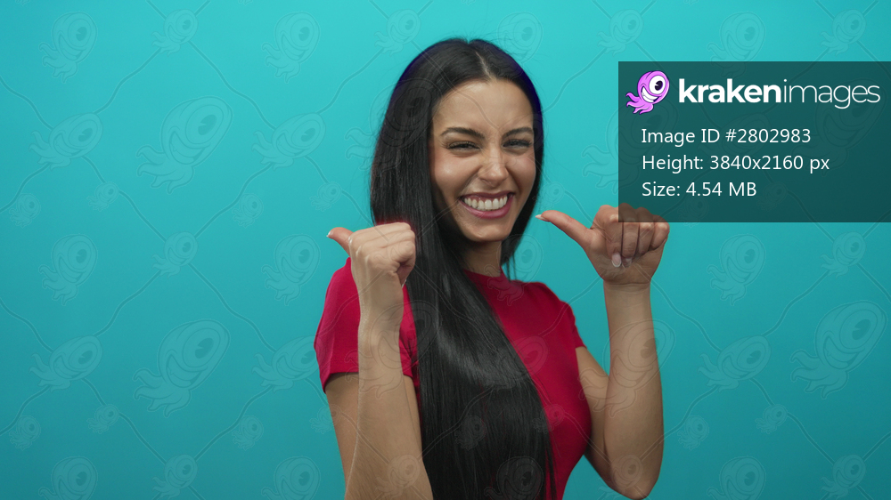 Hispanic woman in red shirt pointing backwards with a joyful smile against a vibrant blue wall isolated background.