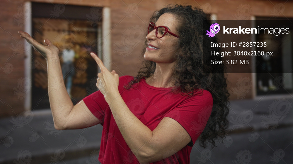 Hispanic woman in red shirt pointing finger and holding open palm on city street; joyful invitation.