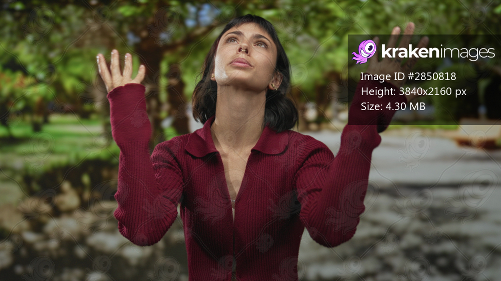 Hispanic woman in red sweater crosses arms and frowns in forest under sunlight with tense posture; anger frustration defiance.