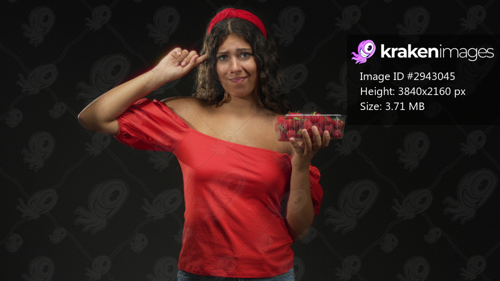 Hispanic woman in red top and headband holds clear container of strawberries with left hand and points finger to temple with right hand in studio; uncertainty choice. - Kraken Images