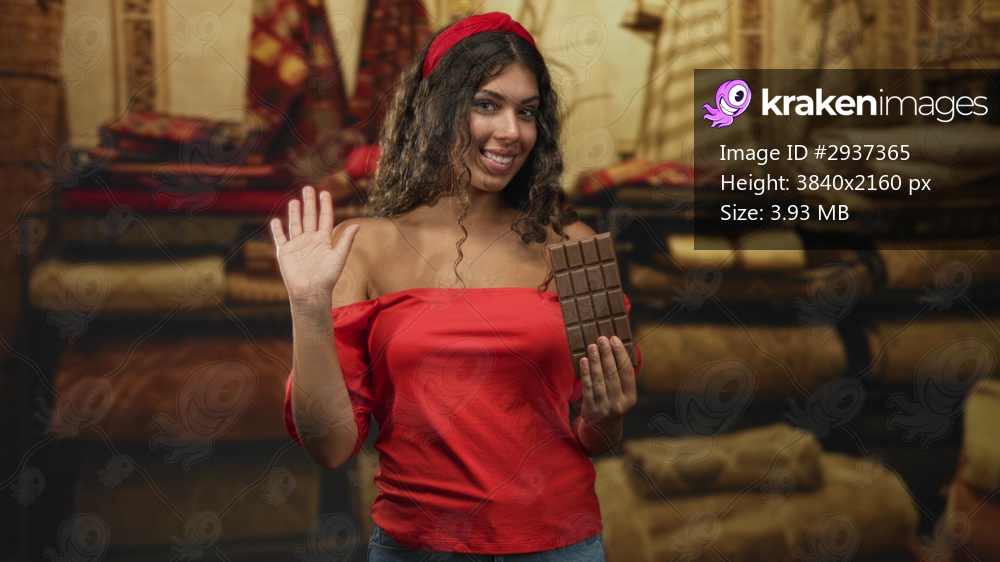 Hispanic woman in red top holds large chocolate bar with right hand and waves left hand in a carpet store aisle amid stacked rugs and cushions; cheerful indulgence. - Kraken Images