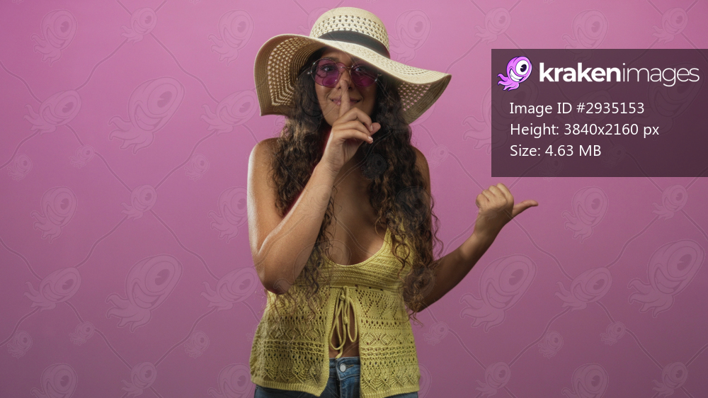 Hispanic woman in straw sunhat and purple sunglasses points thumb to side then makes finger to lips shush in studio; playful secrecy.