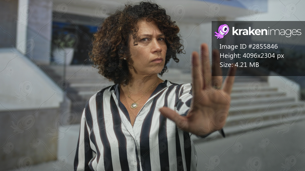 Hispanic woman in striped blouse with curly hair holds her hand up in front of modern building entrance; defiance.